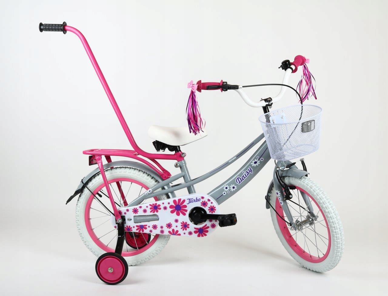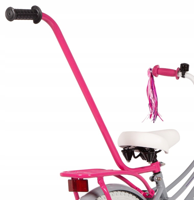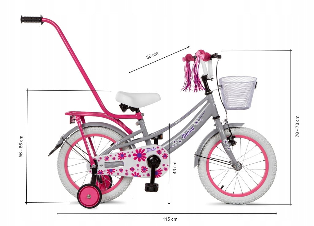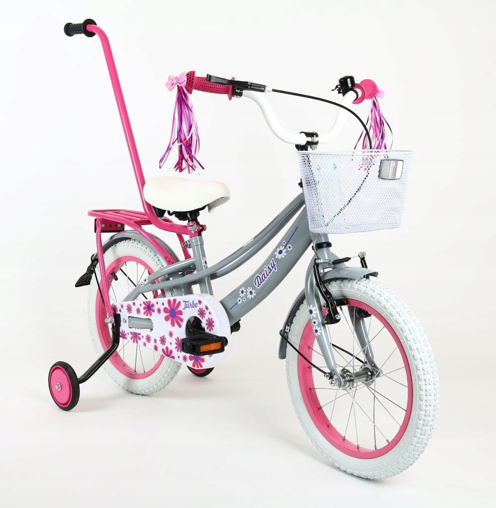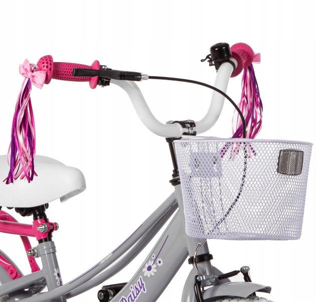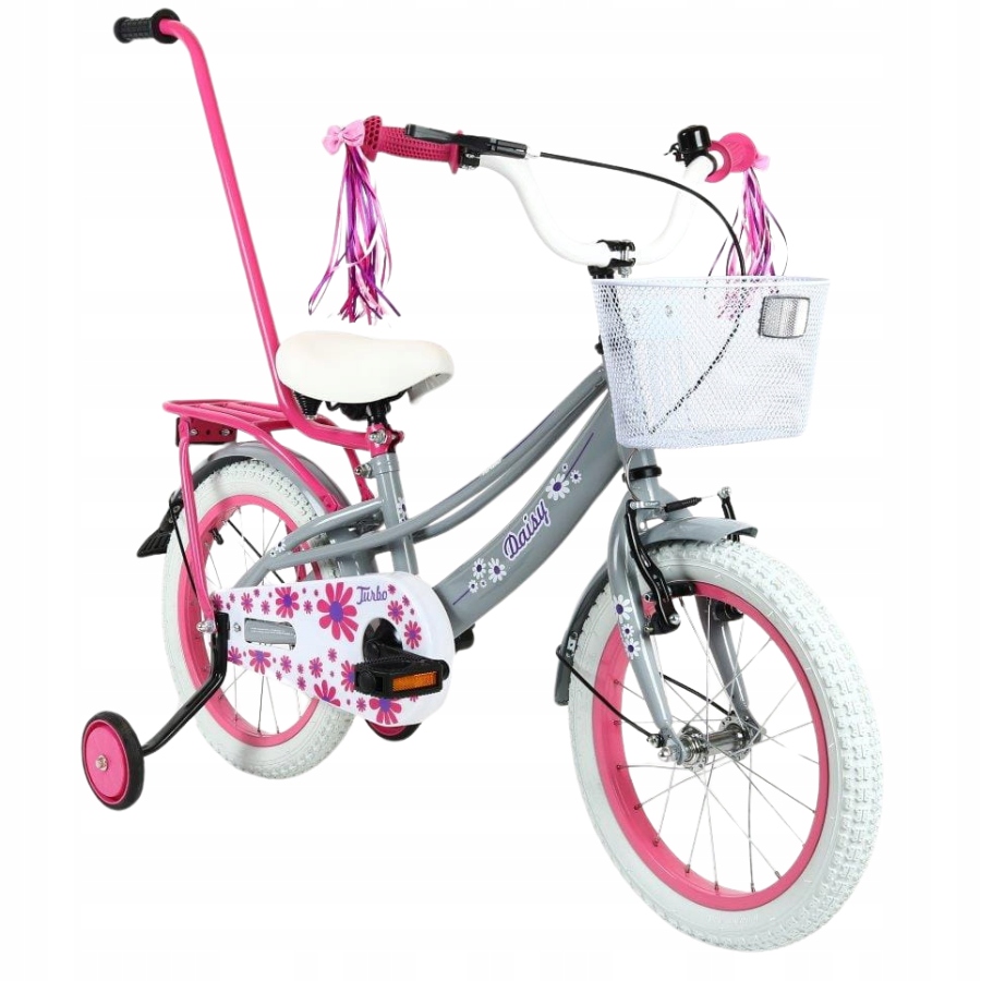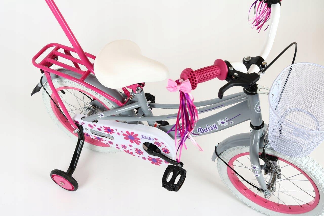 - Wyposażenie dodatkowe: Koszyk na przodzie, błotniki metalowe, bagażnik, prowadnik, kółka boczne, dzwonek, wstążki na kierownicę