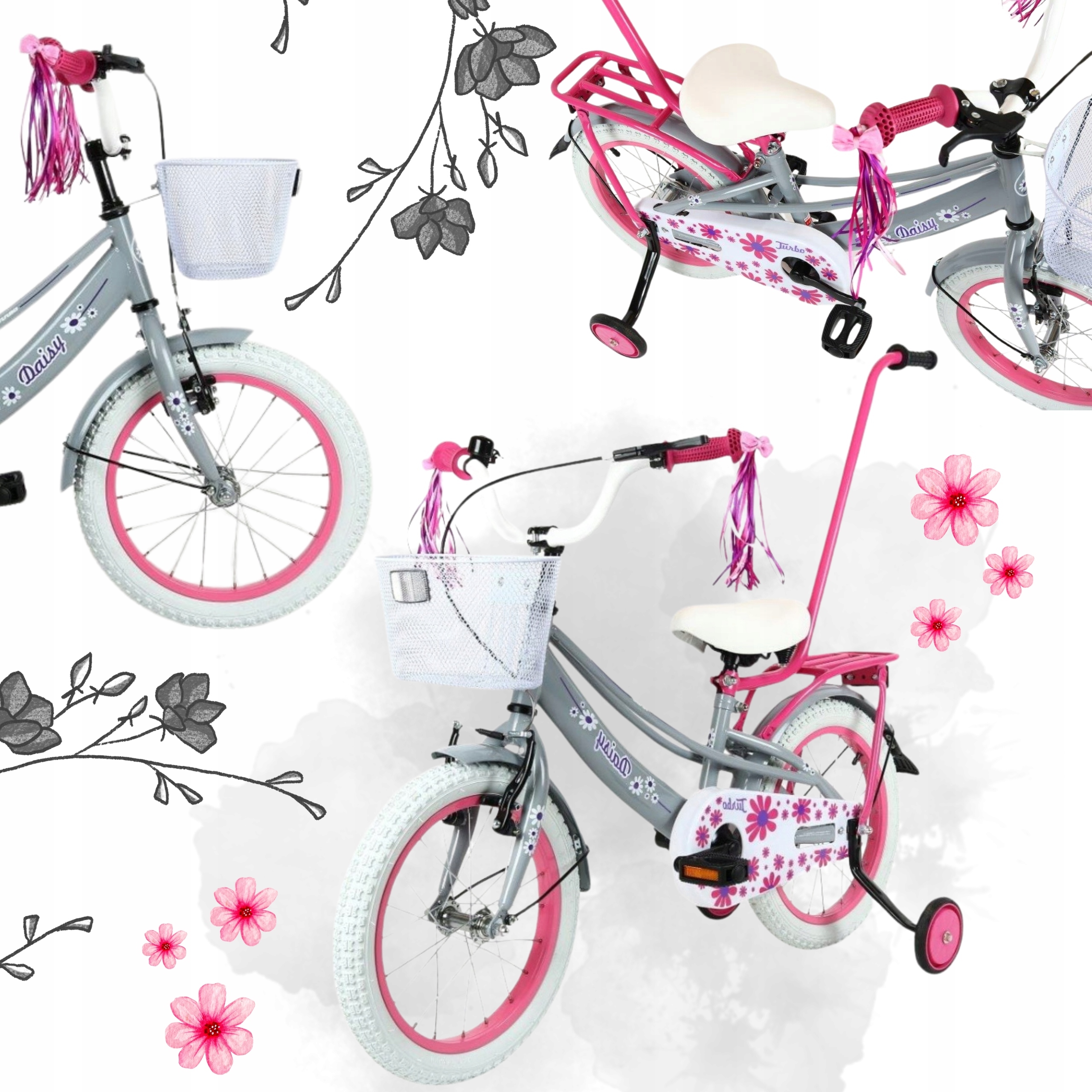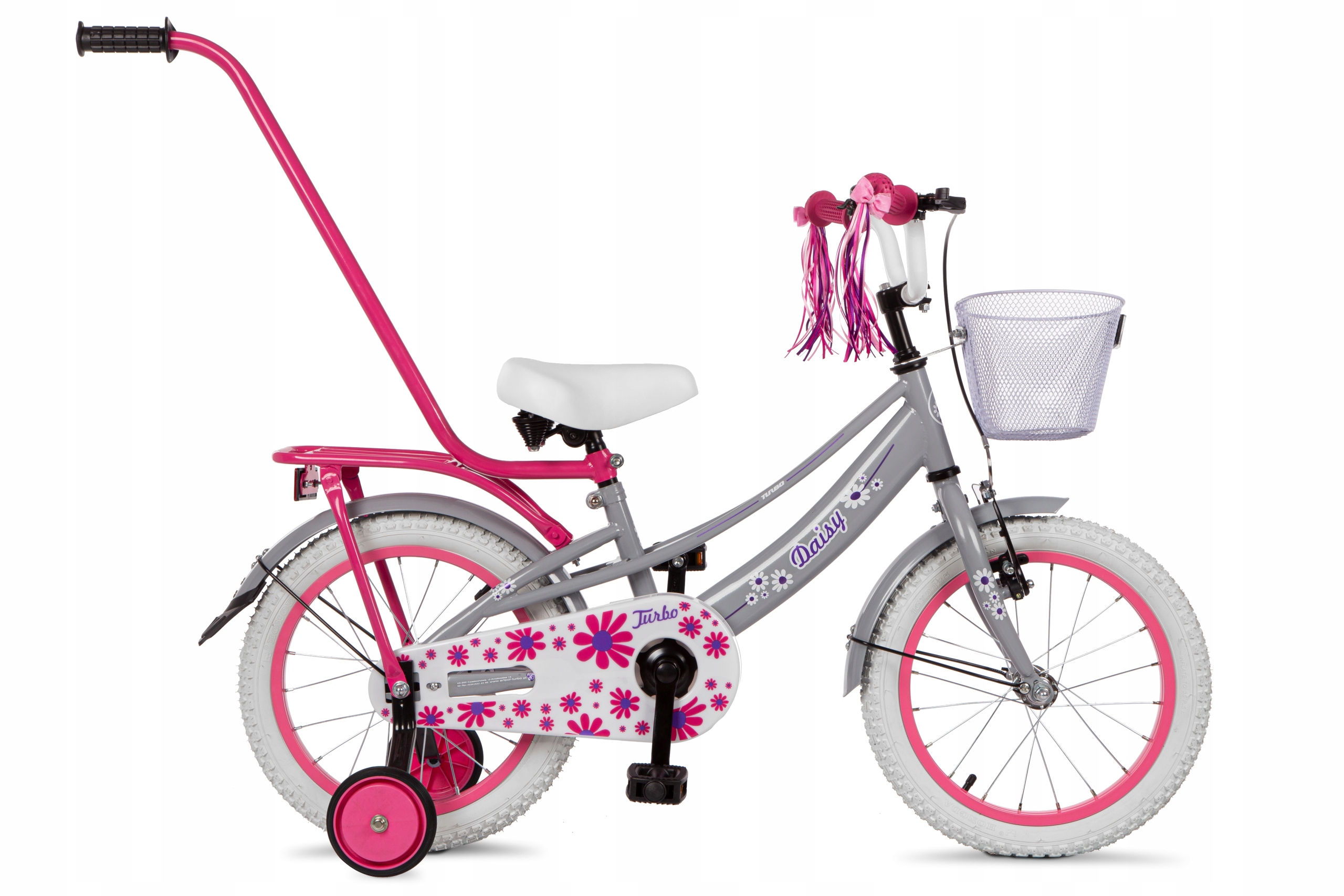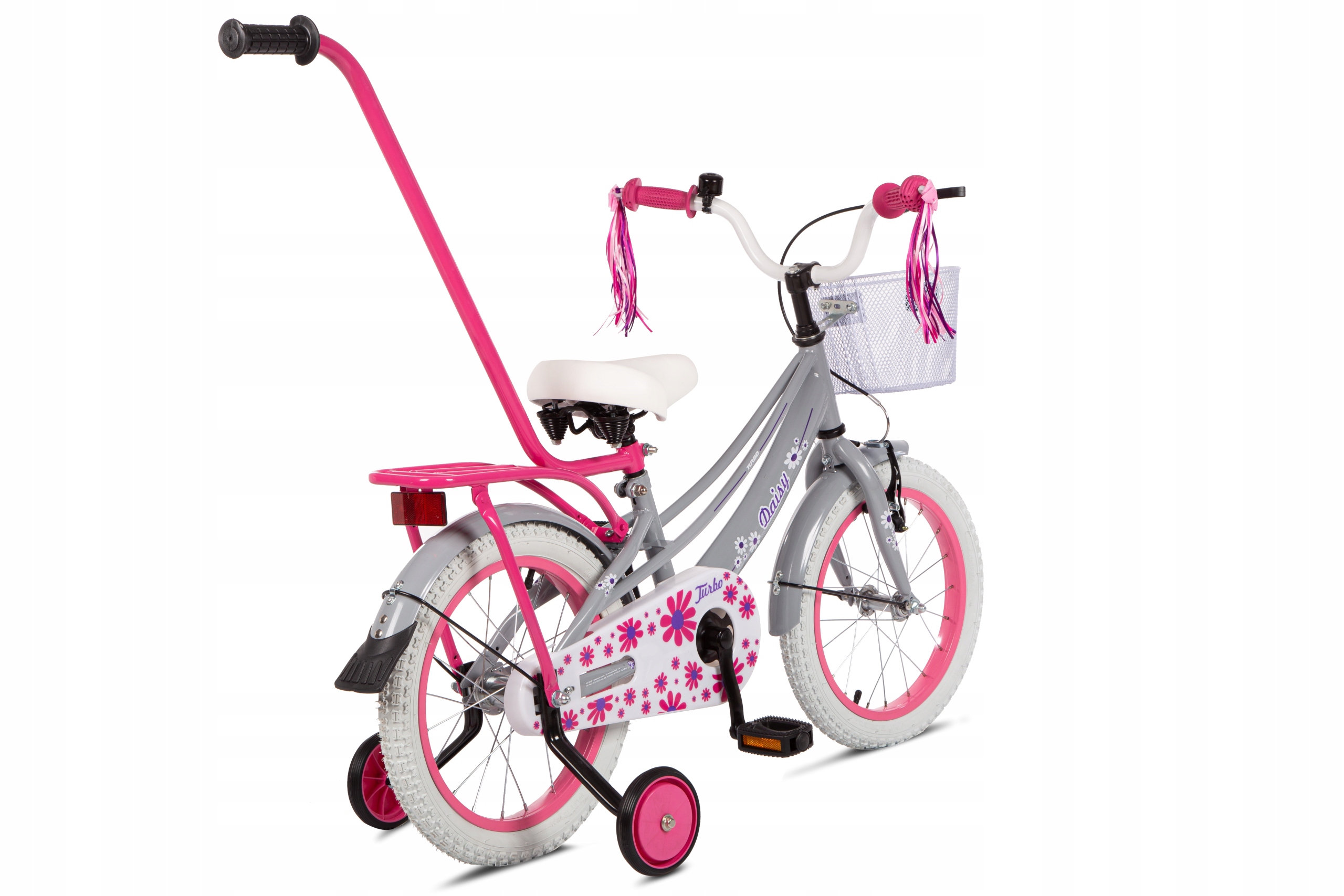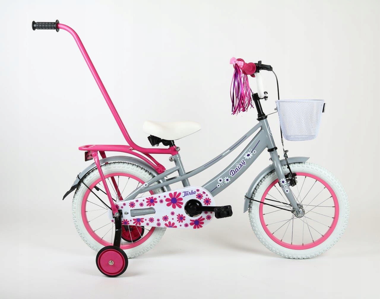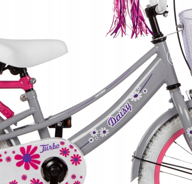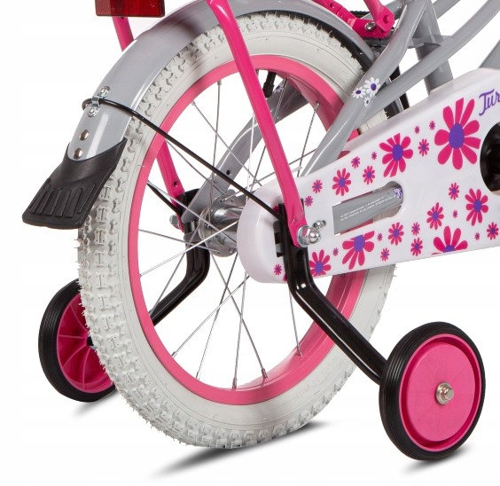 - Wyposażenie dodatkowe: Koszyk na przodzie, błotniki metalowe, bagażnik, prowadnik, kółka boczne, dzwonek, wstążki na kierownicę